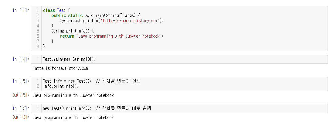 자바는 모두 클래스로 이루어져 있다. 그리고 프로그램의 진입점은 main 함수이다. 그러나 주피터 노트북에서 자바를 실행시킬 때에는 셀 단위로 관리가 되기 때문에 main부터 실행하지 않는다.