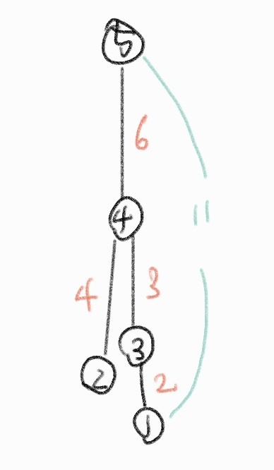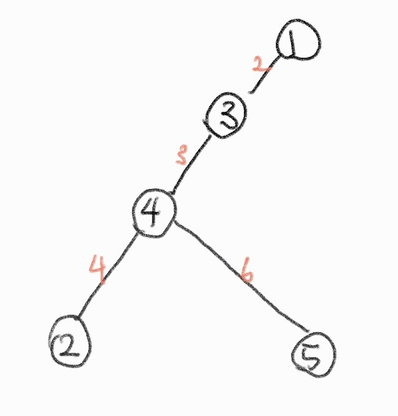 위 그림은 문제의 예제를 트리로 그린 것이다. 주황색 숫자는 간선의 길이를 의미한다.