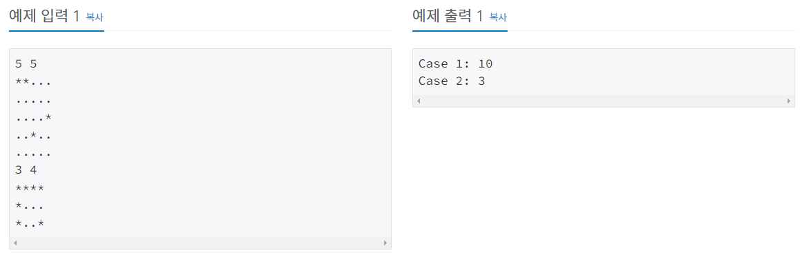 각 테스트 케이스의 첫째 줄에는 보드의 크기를 나타내는 N과 M이 주어진다. N은 세로 크기, M은 가로 크기이고, 두 값은 30보다 작거나 같은 자연수이다. 둘째 줄부터 N개의 줄에는 보드의 상태가 주어진다. 보드의 상태는 장애물을 나타내는 '*'과 빈 칸을 나타내는 '.'으로 이루어져 있다.