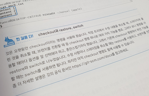 나는 Git과 Github 를 다루는 데 이제는 익숙해져서 이 책에서 소개하는 내용 대부분은 알고 있던 내용들이었다. 하지만 책을 읽는 중 생소한 깃 명령어가 있어서 보니 새로 나온 문법이었다. checkout 명령어가 switch 명령어로 새롭게 지원된다는 사실을 알고 있었는가? 이렇게 새로 바뀐 내용들을 확인하면서 쑥쑥 읽는 재미가 있었다. Git 을 다루는데 익숙한 중급자 이상은 하루~일주일 정도 시간을 가지고 읽어보는 것을 추천한다.