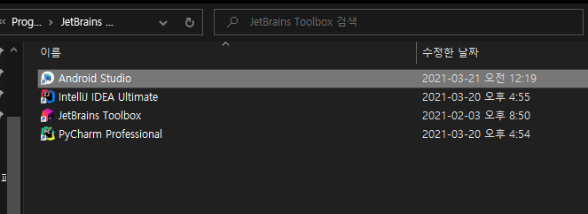 [실행]에서 입력하기 편하게 Android Studio -> android 로 이름을 변경했다.